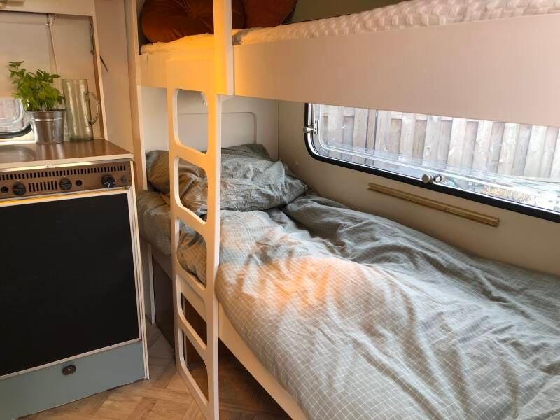 Hieke was op zoek naar een caravan en vond een mooie, die ze door ons heeft laten restylen. Een speciale wens was een stapelbed. En die is er in gekomen!